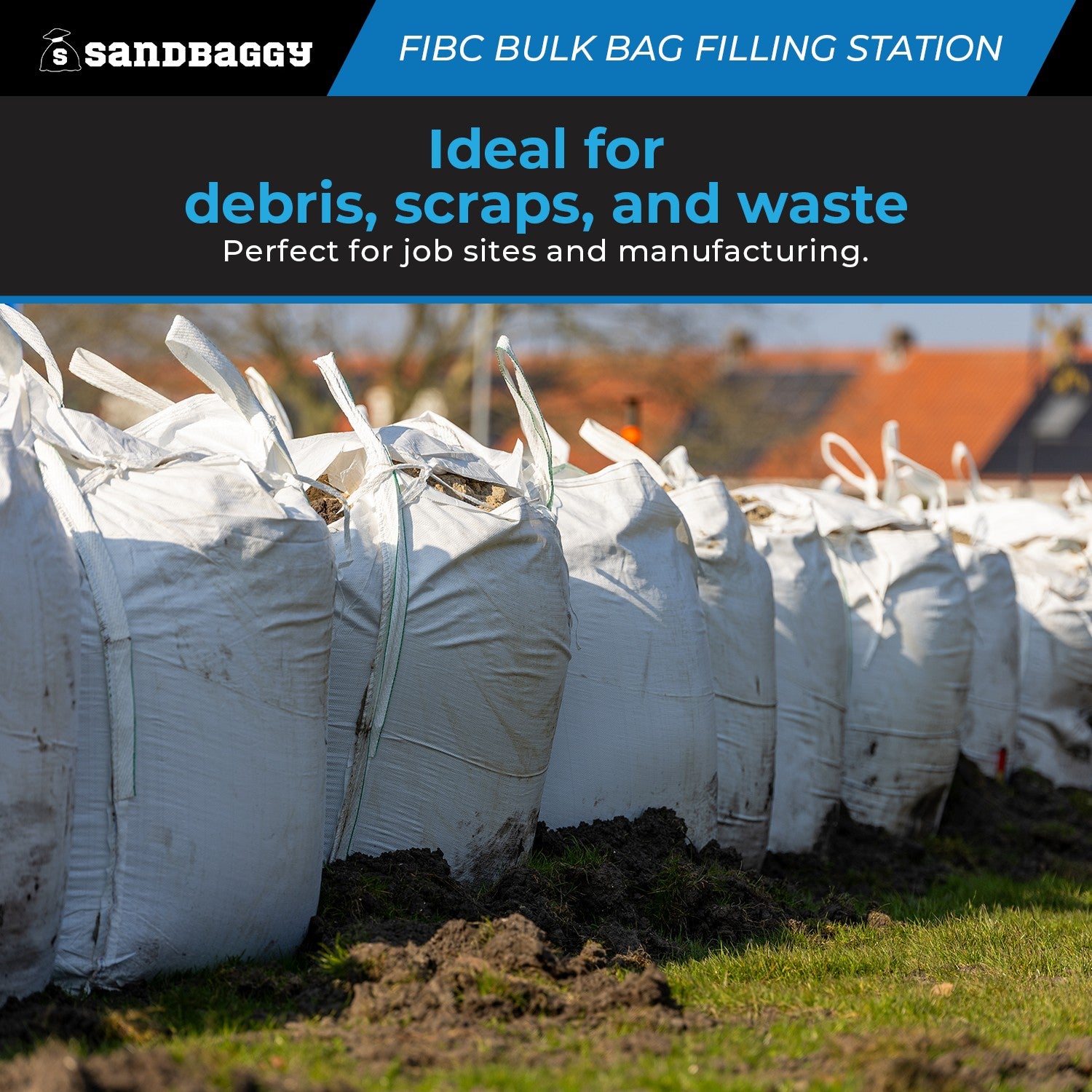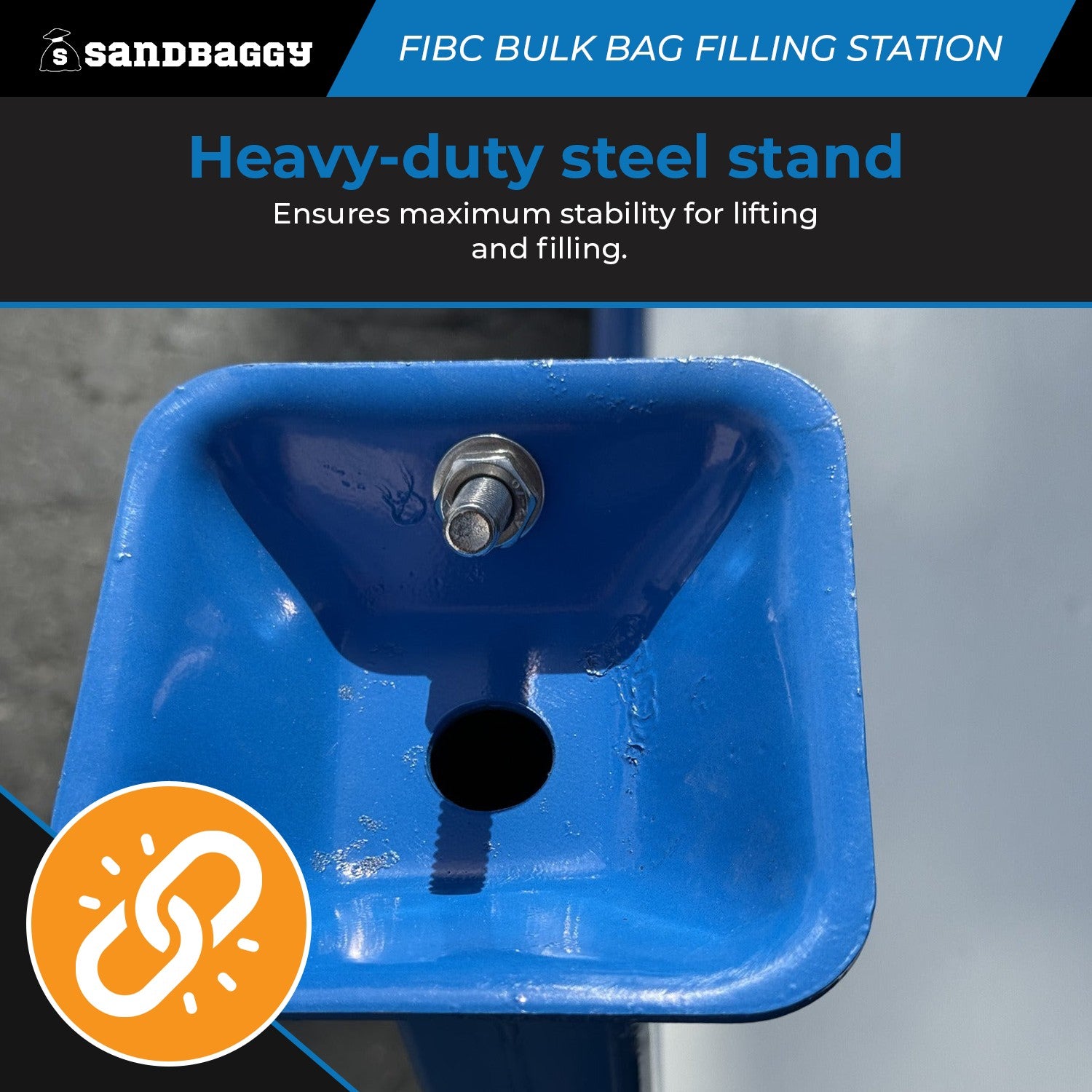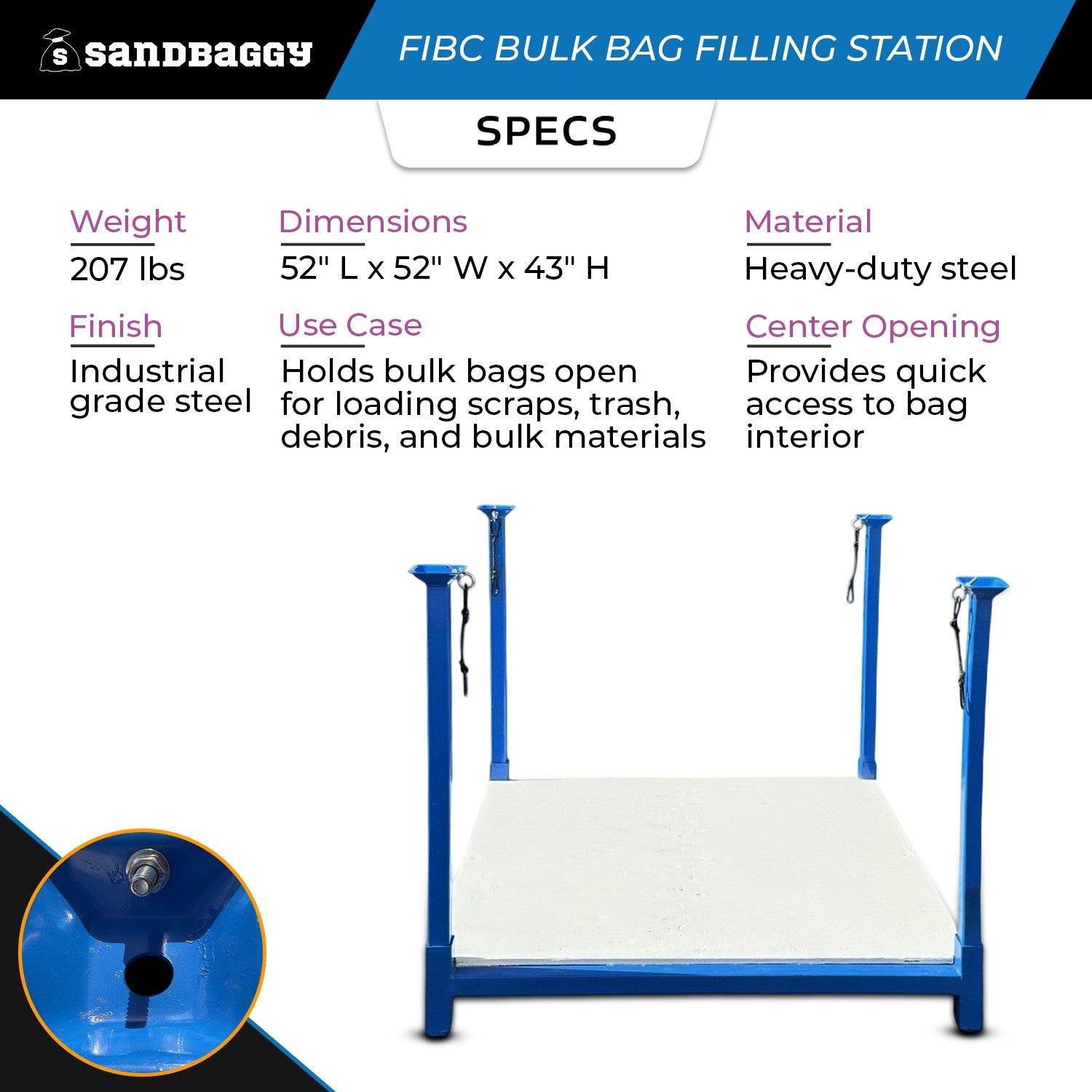 Streamline your loading process with the Sandbaggy Bulk Bag Filling Station — a heavy-duty steel support frame designed to hold bulk bags wide open and ready to fill. No more struggling with collapsed bags or needing two workers to hold the bag upright. This filling station keeps your FIBC bag securely open for fast, efficient loading of scraps, trash, debris, or bulk materials.