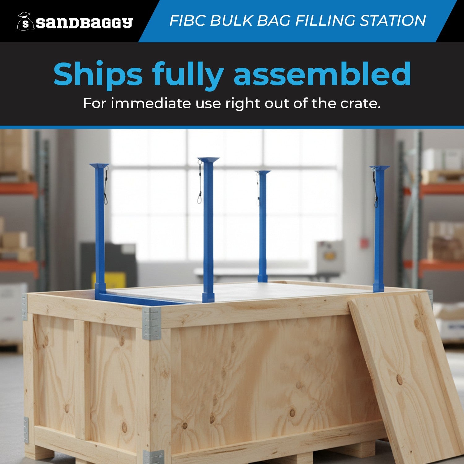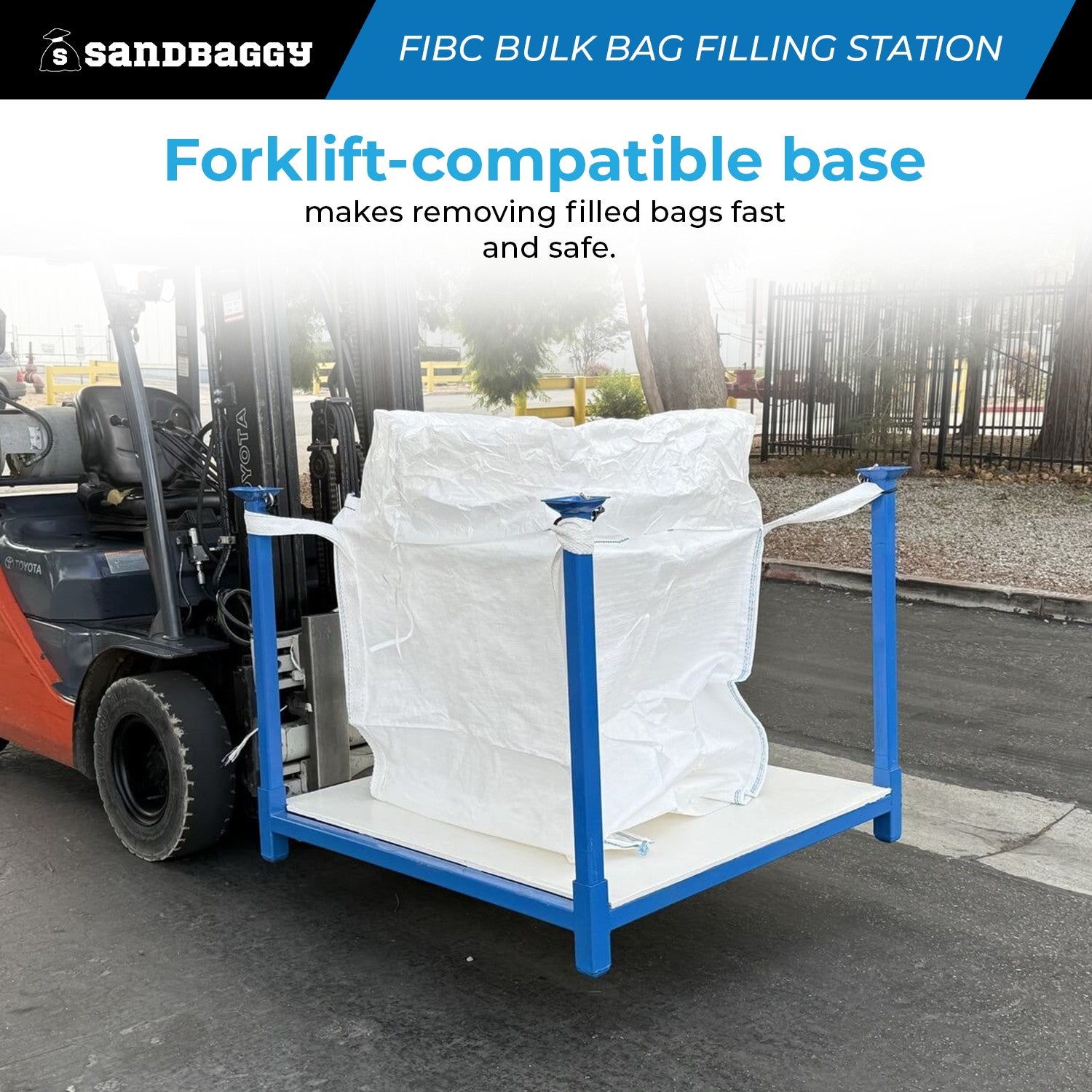 - Forklift-compatible base makes removing filled bags fast and safe.