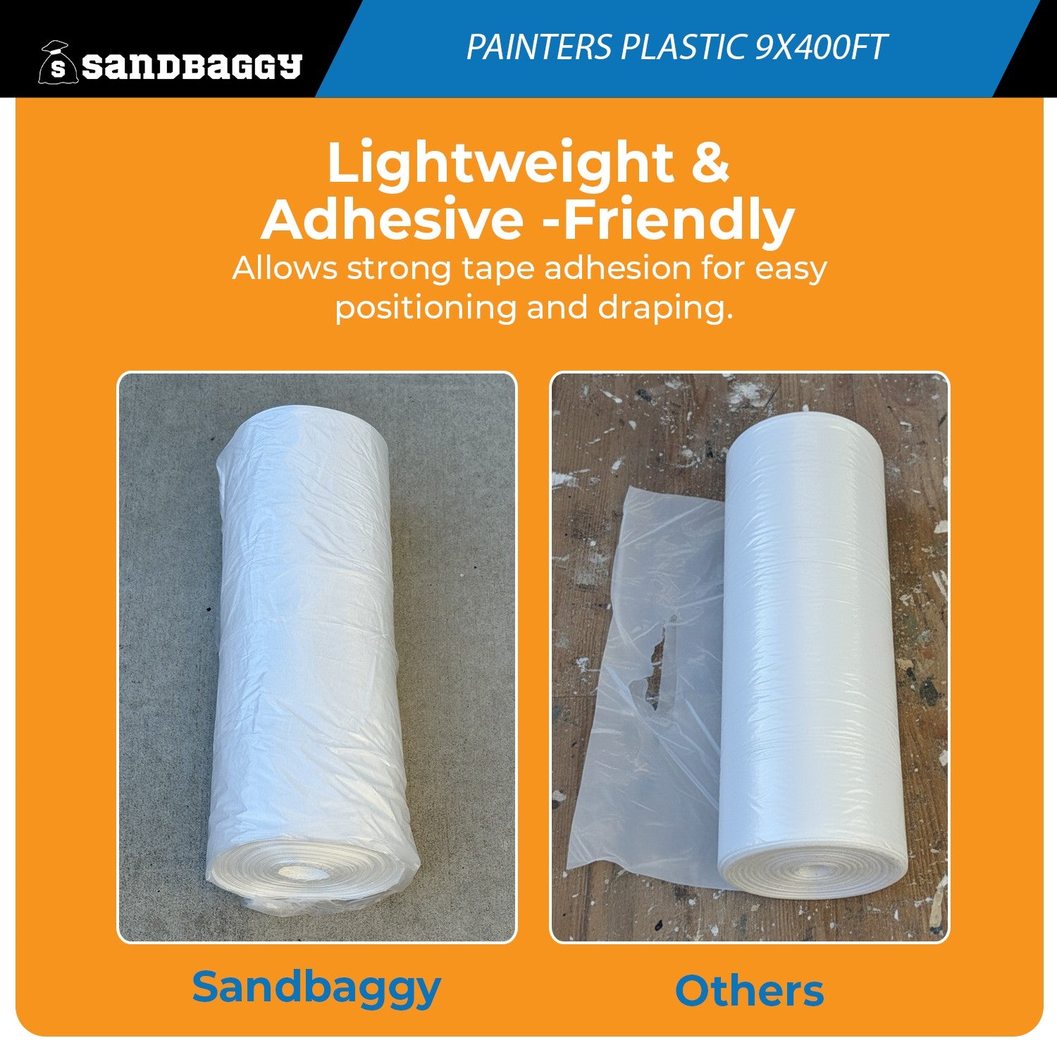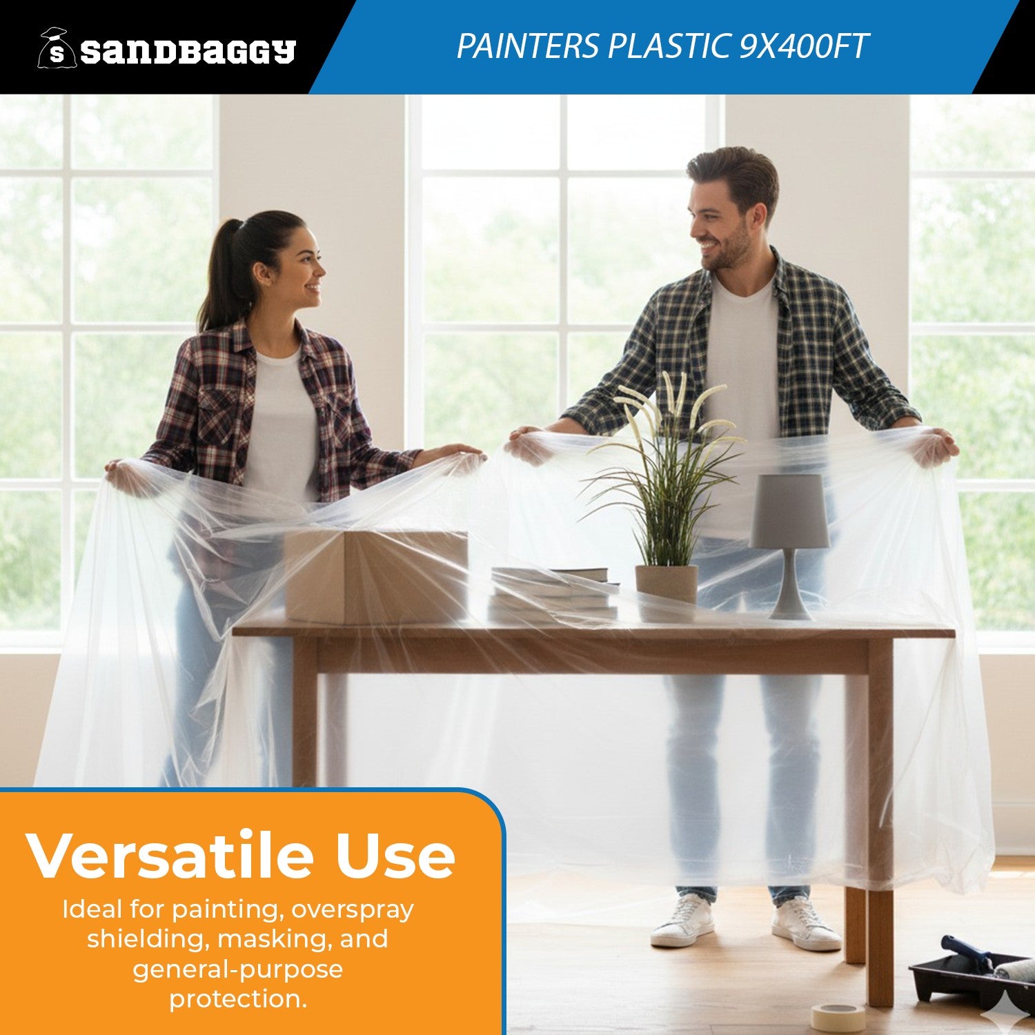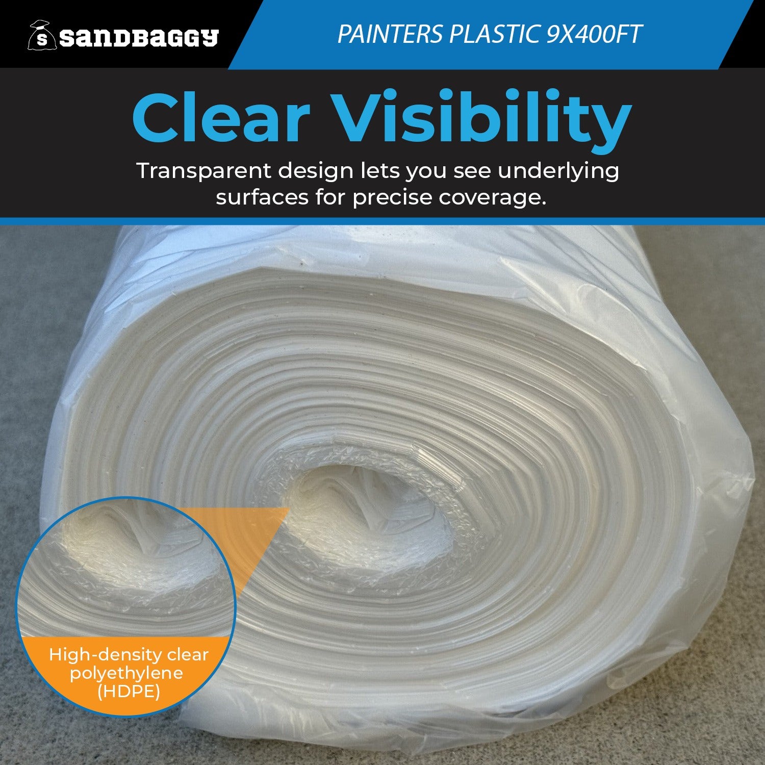 Safeguard floors, furniture, and surfaces during any paint job with Sandbaggy Painters Plastic Sheeting. Made in the USA from high-density clear polyethylene, this 9 ft x 400 ft roll provides dependable coverage that prevents damage from accidental spills, splatter, dust, and overspray.