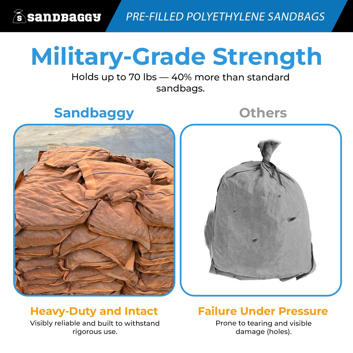 - Military-Grade Strength: Holds up to 70 lbs — 40% more than standard sandbags.