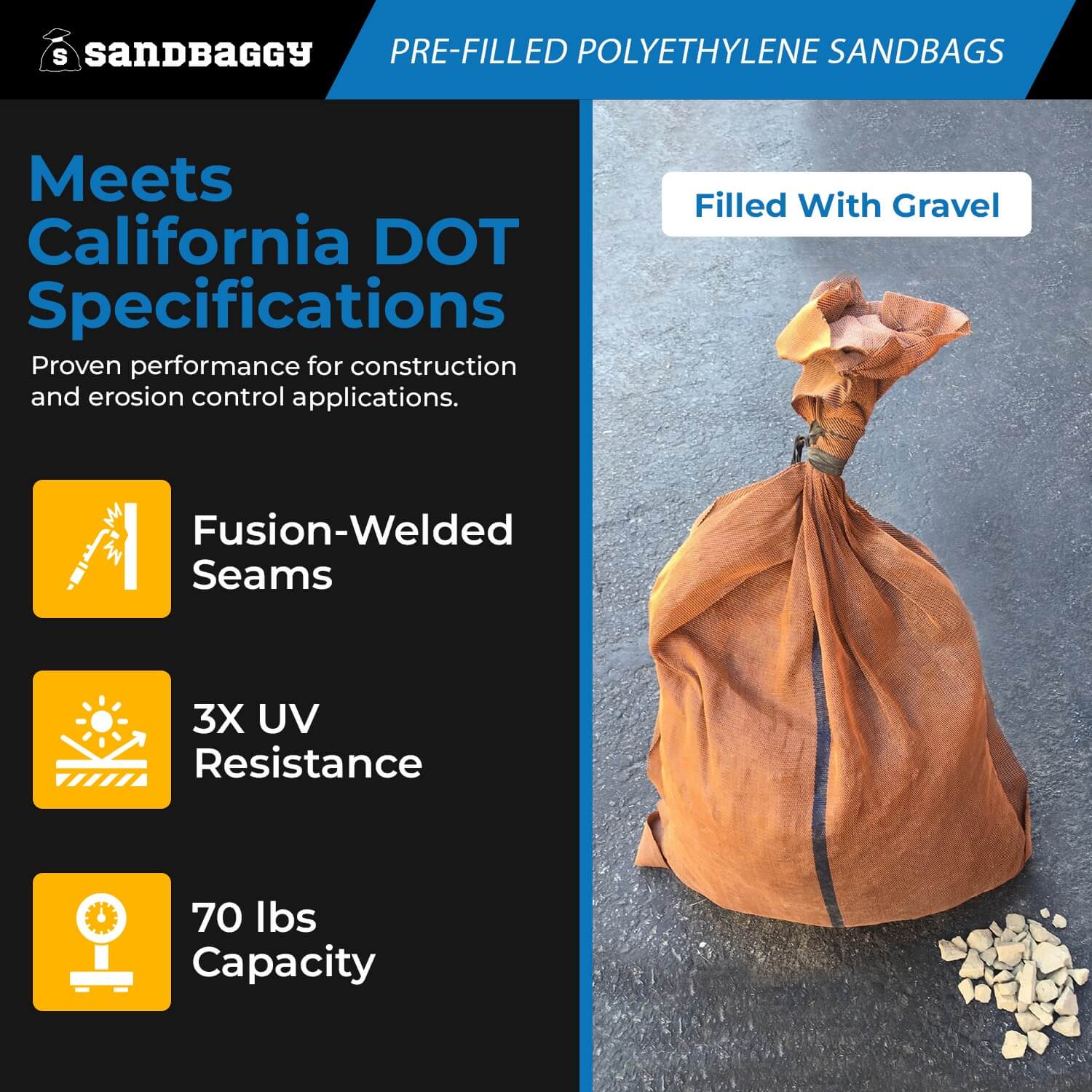 Each bag is professionally filled in the USA to ensure consistent weight, quality, and readiness for use. Built to California DOT specifications, each bag supports up to 70 lbs of gravel or rocks without tearing. With fusion-welded seams and a secure tie string closure, these sandbags are ideal for long-term outdoor use where strength and stability matter most.