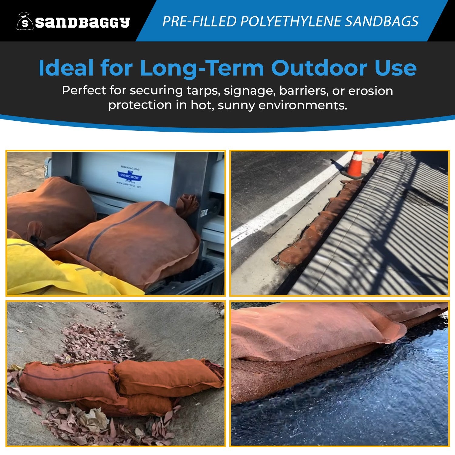 Polyethylene: Very water-resistant and durable. Polyethylene is the most resistant to UV degradation as compared to other types of sandbags.
