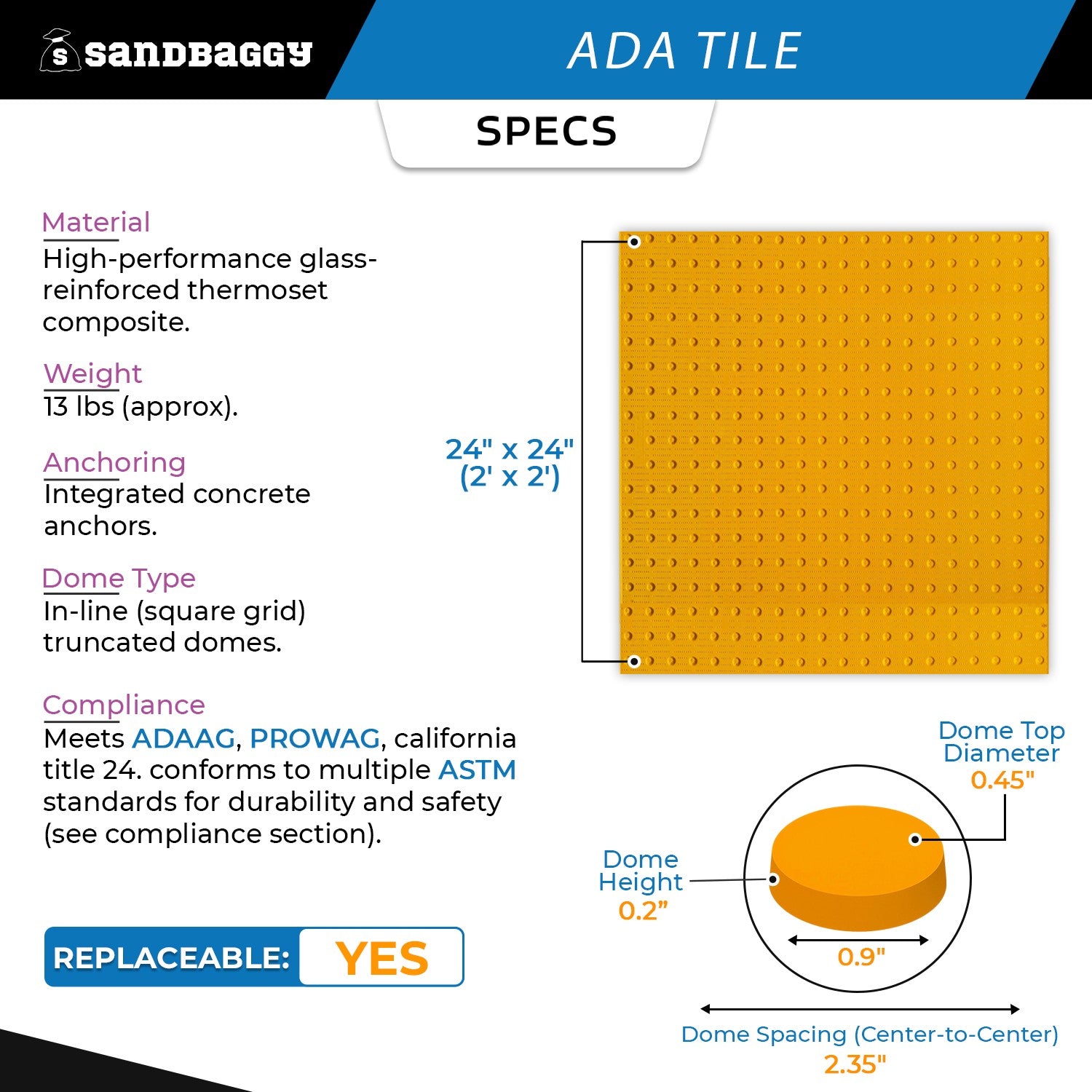 Ensure pedestrian safety with Sandbaggy's 24" x 24" cast in place ADA tile. This replaceable tactile panel features robust truncated domes for reliable, wet-set concrete installations, offering durable compliance.