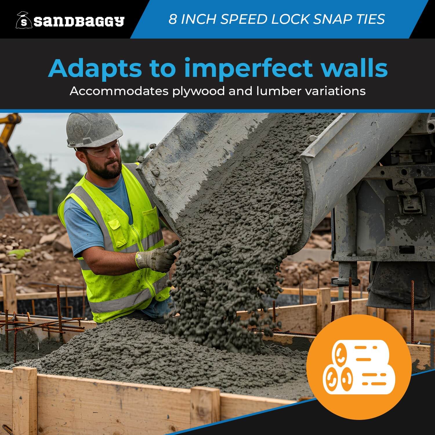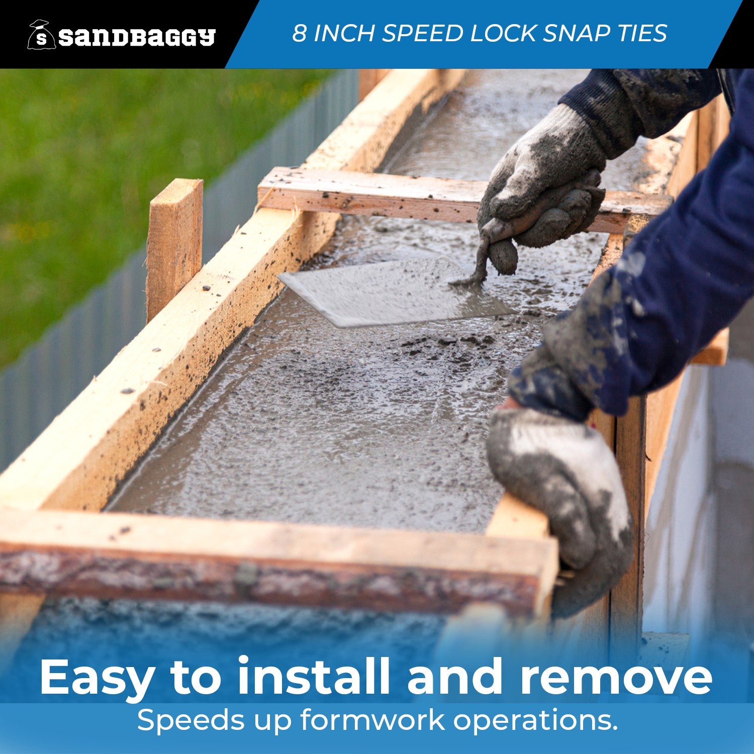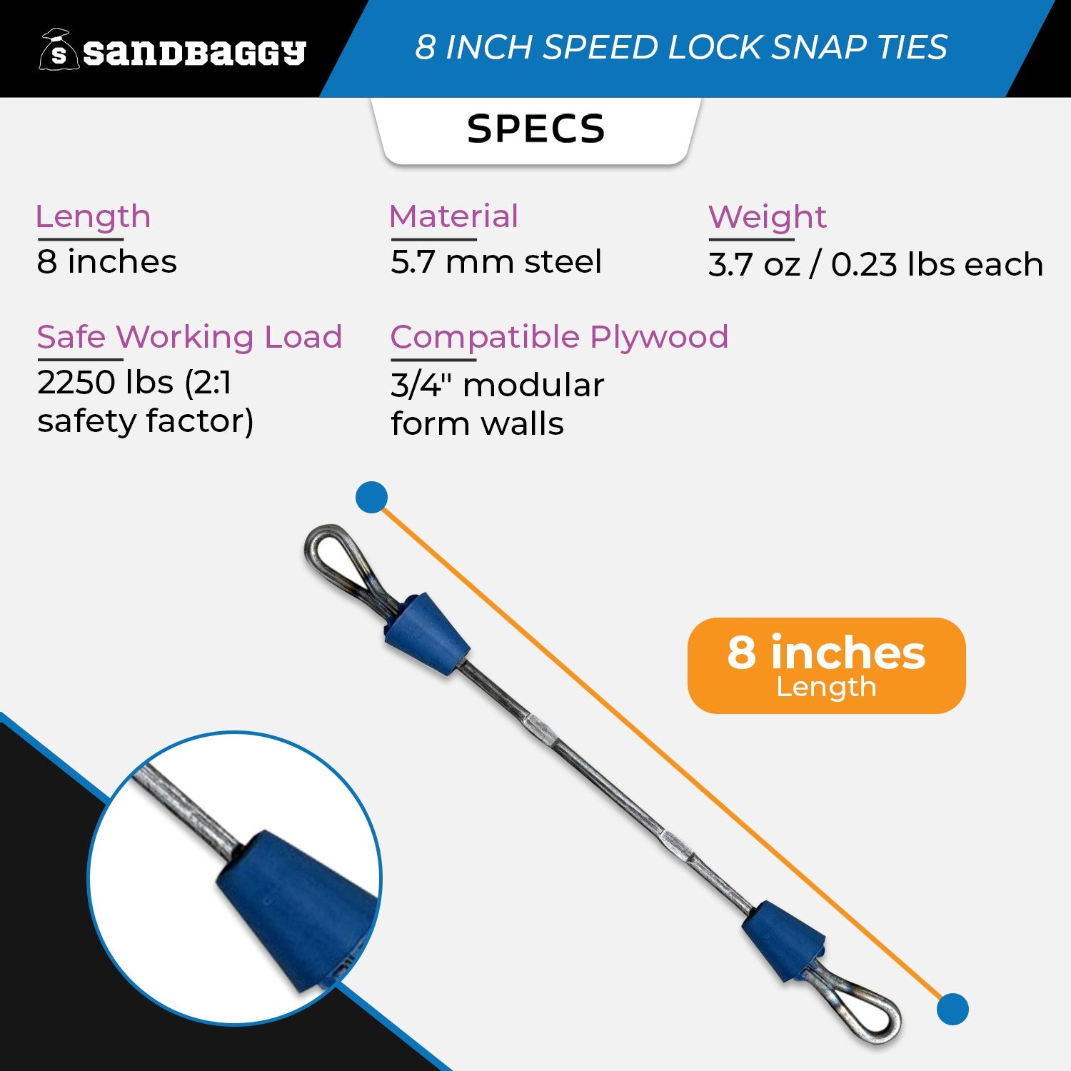 The 8-inch Speed Lock Snap Tie securely holds modular form walls while allowing quick installation and removal. Made from durable 5.7 mm steel, each tie supports a 2250 lb safe working load (2:1 safety factor) and features a self-centering cone for precise alignment. It adapts to plywood and lumber variations, ensuring reliable break-back operation even on imperfect surfaces.