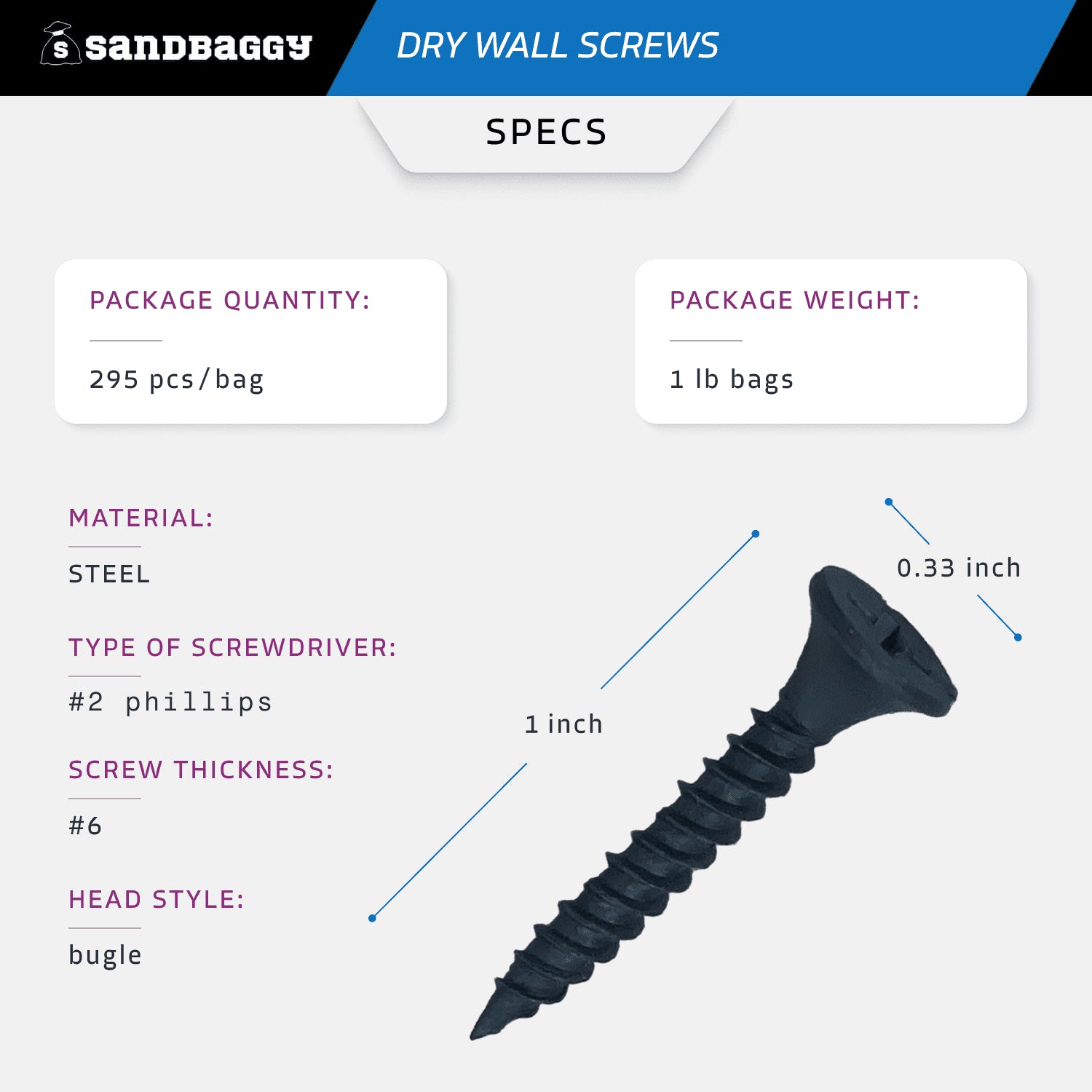 Enhance your drywall projects with our 1-inch Bugle Coarse Thread Dry wall Screws. Engineered with a black phosphate coating for exceptional corrosion resistance and optimal mud adhesion, these screws are perfect for securely attaching gypsum drywall to wood studs. Each 1 lb bag is packed with 295 screws. These premium #6 x 1" drywall screws ensure a sturdy and long-lasting installation every time and are essential for interior wall application.