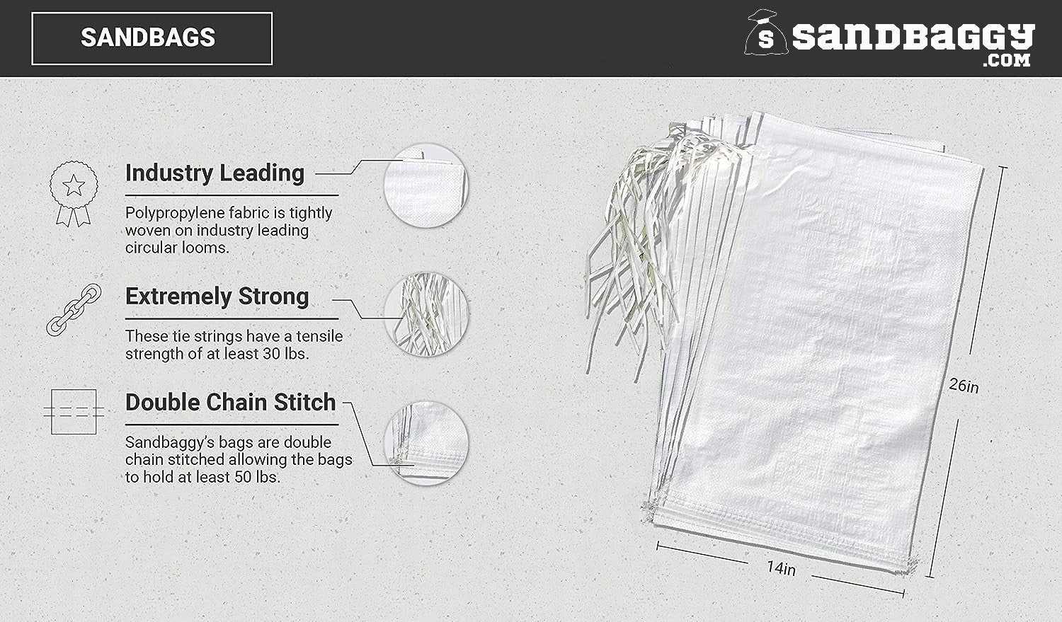 Sandbaggy 14” x 26” White Sandbags are a standard all-purpose sandbag great for so many tasks! Fill up these empty sandbags with sand, rocks, gravel, etc., then use the attached tie strings to close them, and you’re good to go. Durable enough for construction and erosion control, reliable enough for emergencies like flooding, and versatile enough for daily use like weighing down a truck bed. These sandbags can really do it all.