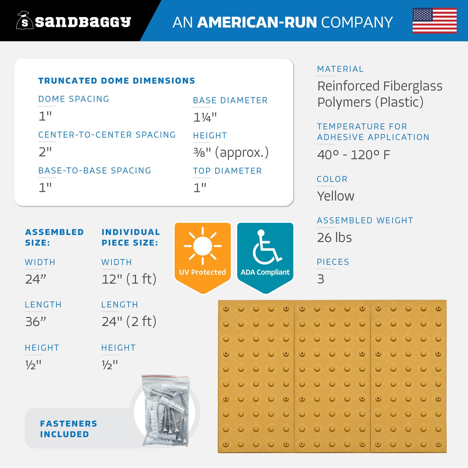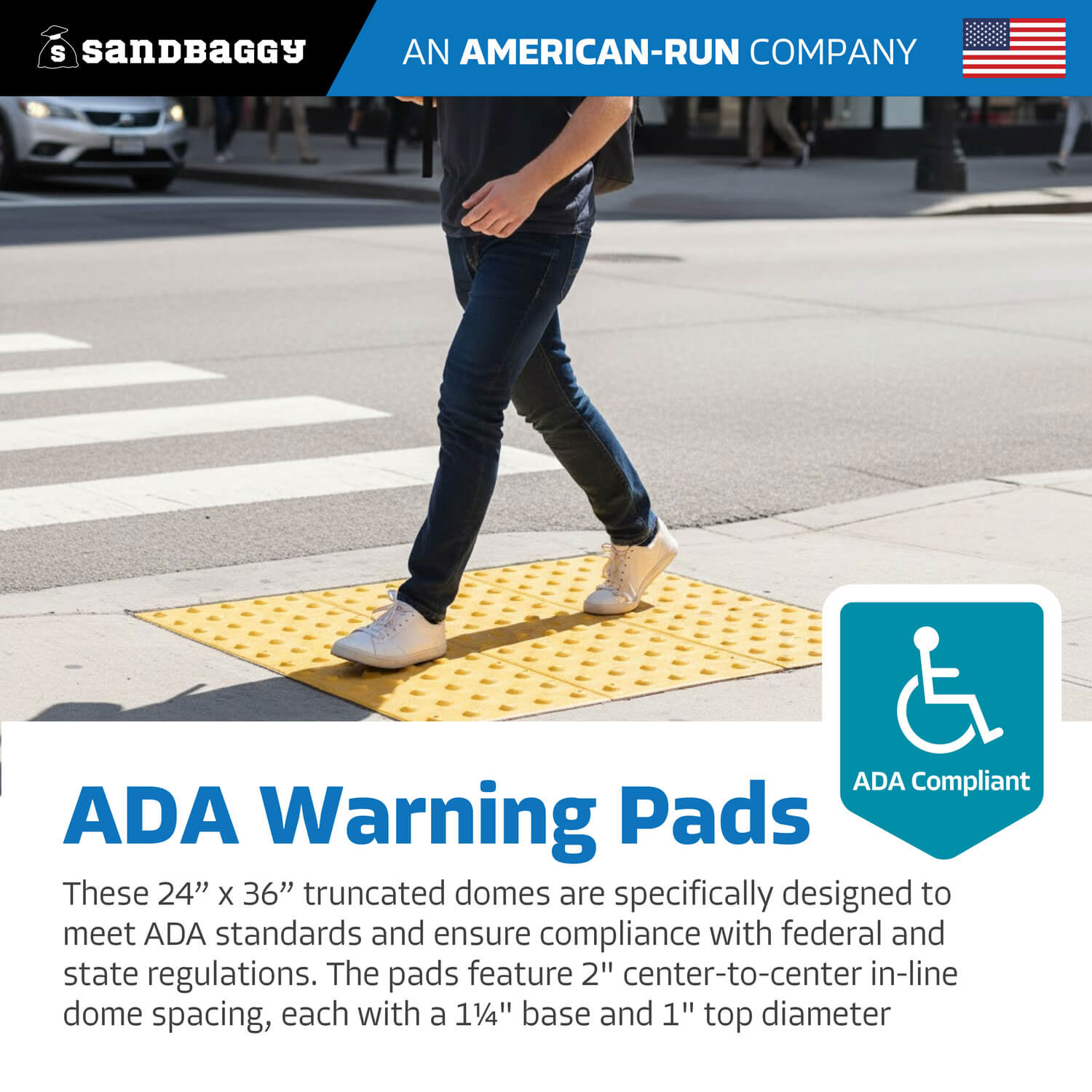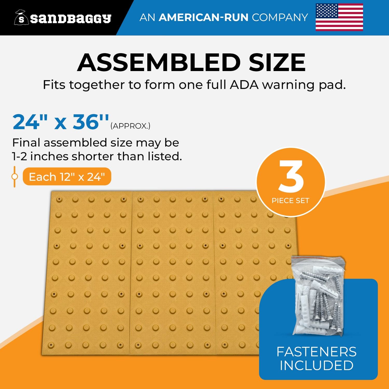 Our ADA compliant truncated domes are designed to ensure safety and accessibility for all pedestrians. This 3-piece ADA pad set assembles to a total size of 24" x 36" x 1/2" and weighs 15.6 lbs in total. Each piece measures 12" x 24", and when combined, they provide essential tactile ground surface indicators that comply with ADA regulations. Ideal for installation on dry concrete, these ADA mats are used to create a detectable boundary between pedestrian walkways and vehicular traffic areas. Sandbaggy ADA warning pads have a max UV protection for an extended life under the sun. (More sizes and styles available)