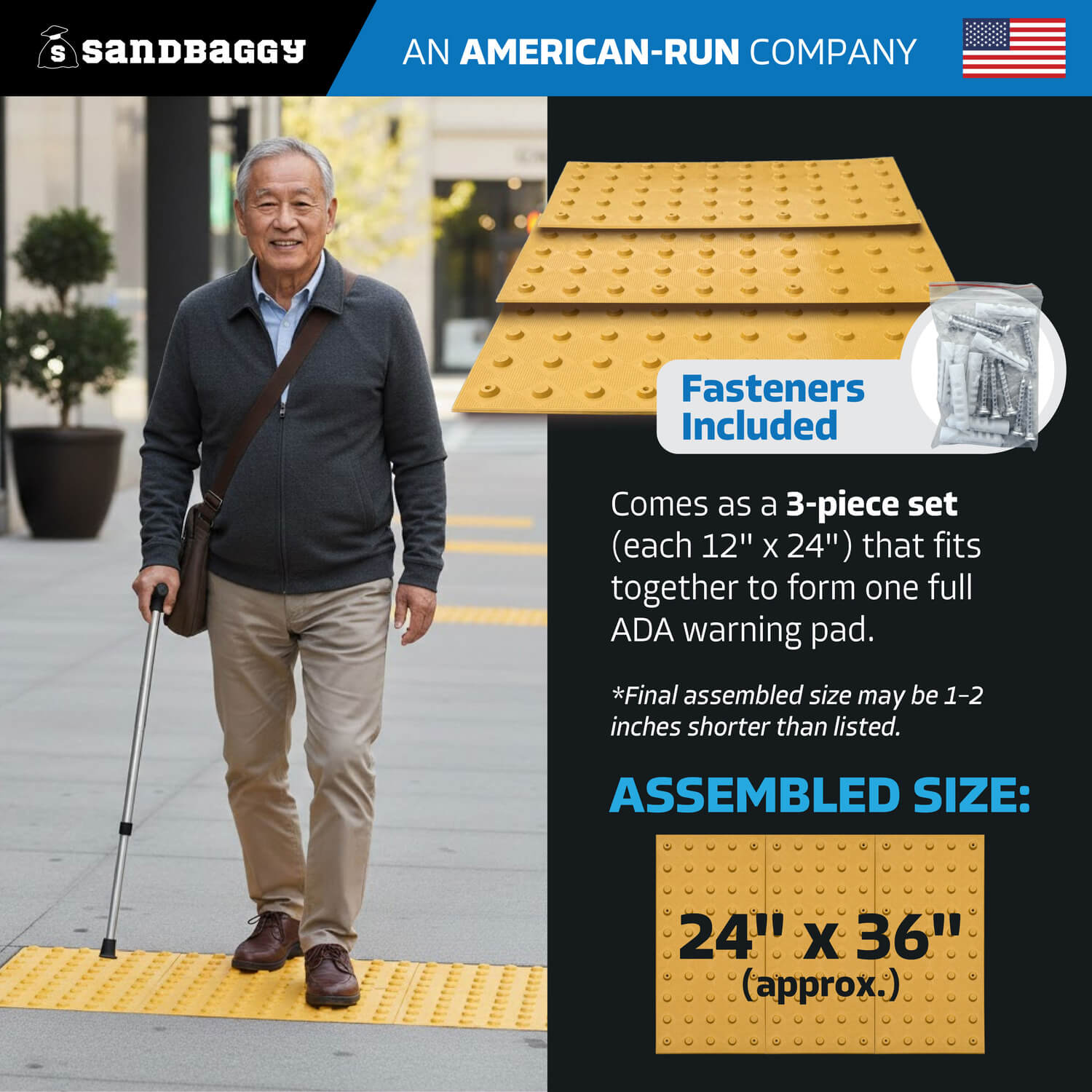 - Assembled Size 24" x 36" (approx.) – Comes as a 3-piece set (each 12" x 24") that fits together to form one full ADA warning pad. Final assembled size may be 1–2 inches shorter than listed.