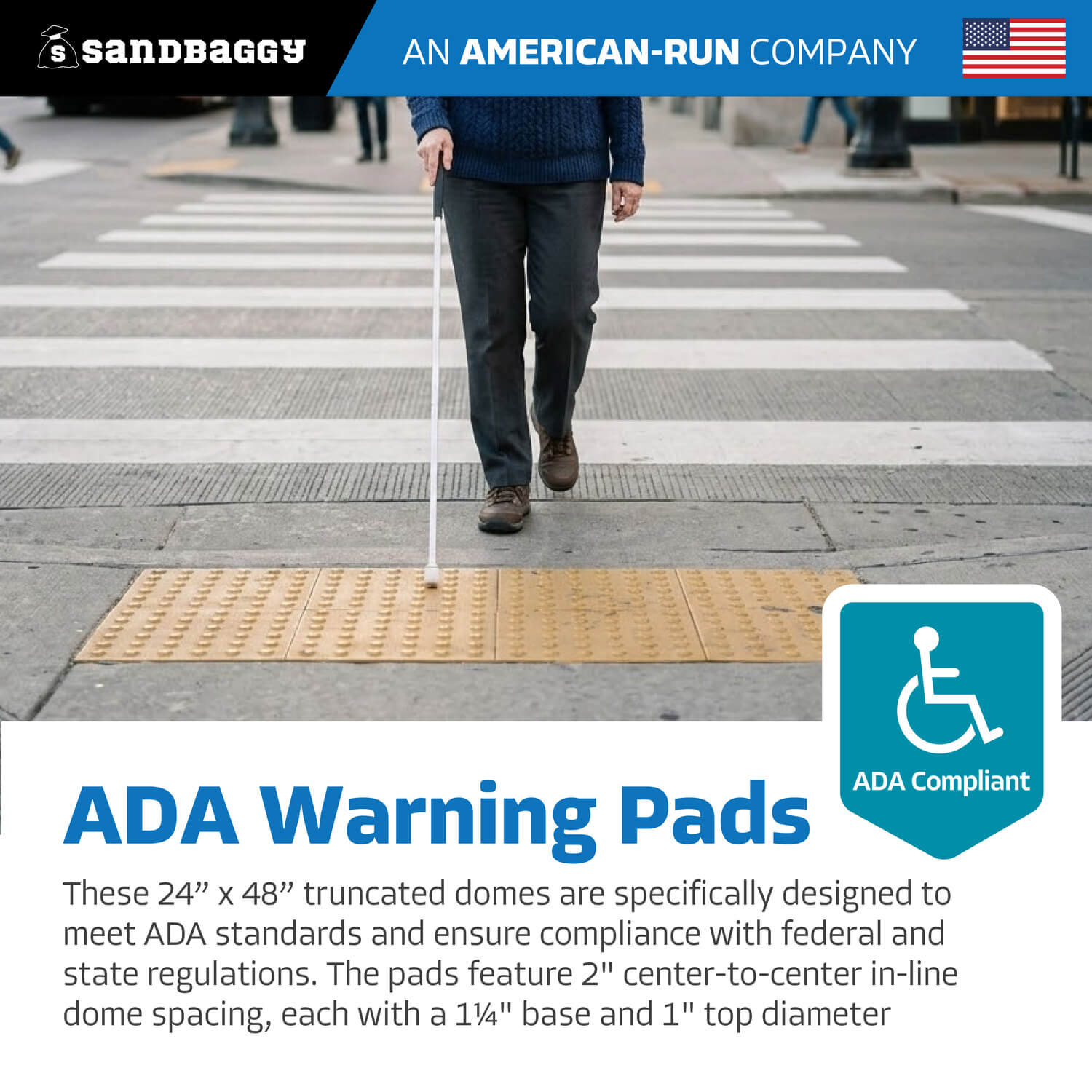 Our ADA compliant truncated domes are designed to ensure safety and accessibility for all pedestrians. This 4-piece ADA pad set assembles to a total size of 24" x 48" x 1/2" and weighs 20.8 lbs in total. Each piece measures 12" x 24", and when combined, they provide essential tactile ground surface indicators that comply with ADA regulations. Ideal for installation on dry concrete, these ADA mats are used to create a detectable boundary between pedestrian walkways and vehicular traffic areas. Sandbaggy ADA warning pads have a max UV protection for an extended life under the sun. (More sizes and styles available)