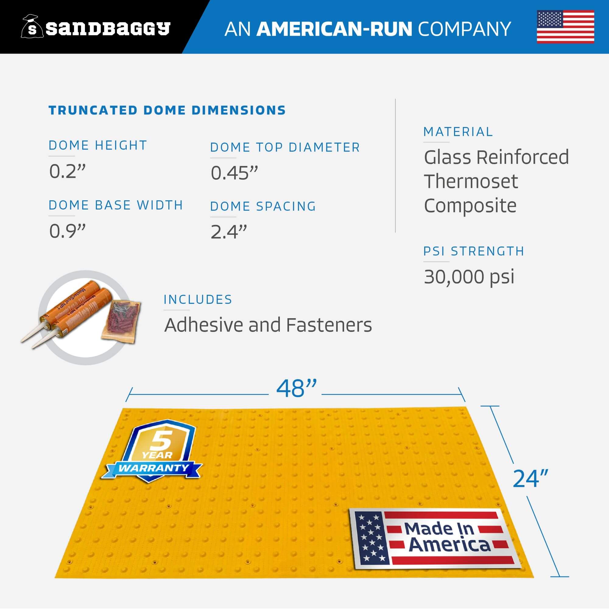 Our ADA compliant, USA made 24" x 48" truncated domes are designed to ensure safety and accessibility for all pedestrians. These ADA pads, measuring 24" x 48" and weighing 17 lbs each, provide essential tactile ground surface indicators that comply with ADA regulations. Ideal for installation on dry concrete, these ADA mats are used to create a detectable boundary between pedestrian walkways and vehicular traffic areas. Sandbaggy ADA warning pads have a max UV protection for an extended life under the sun. (More sizes and styles available)