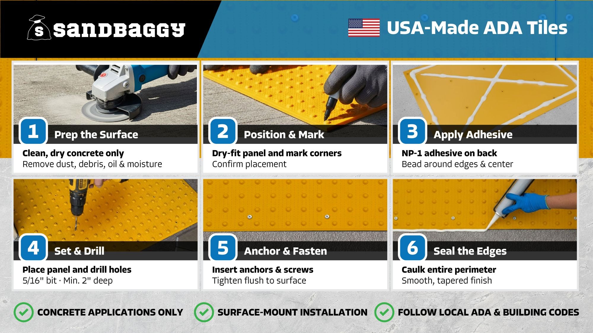 - Confirm that the concrete substrate is in full compliance with Federal, State, local standards, building codes, project plans and specifications, prior to installation of Sandbaggy panel.