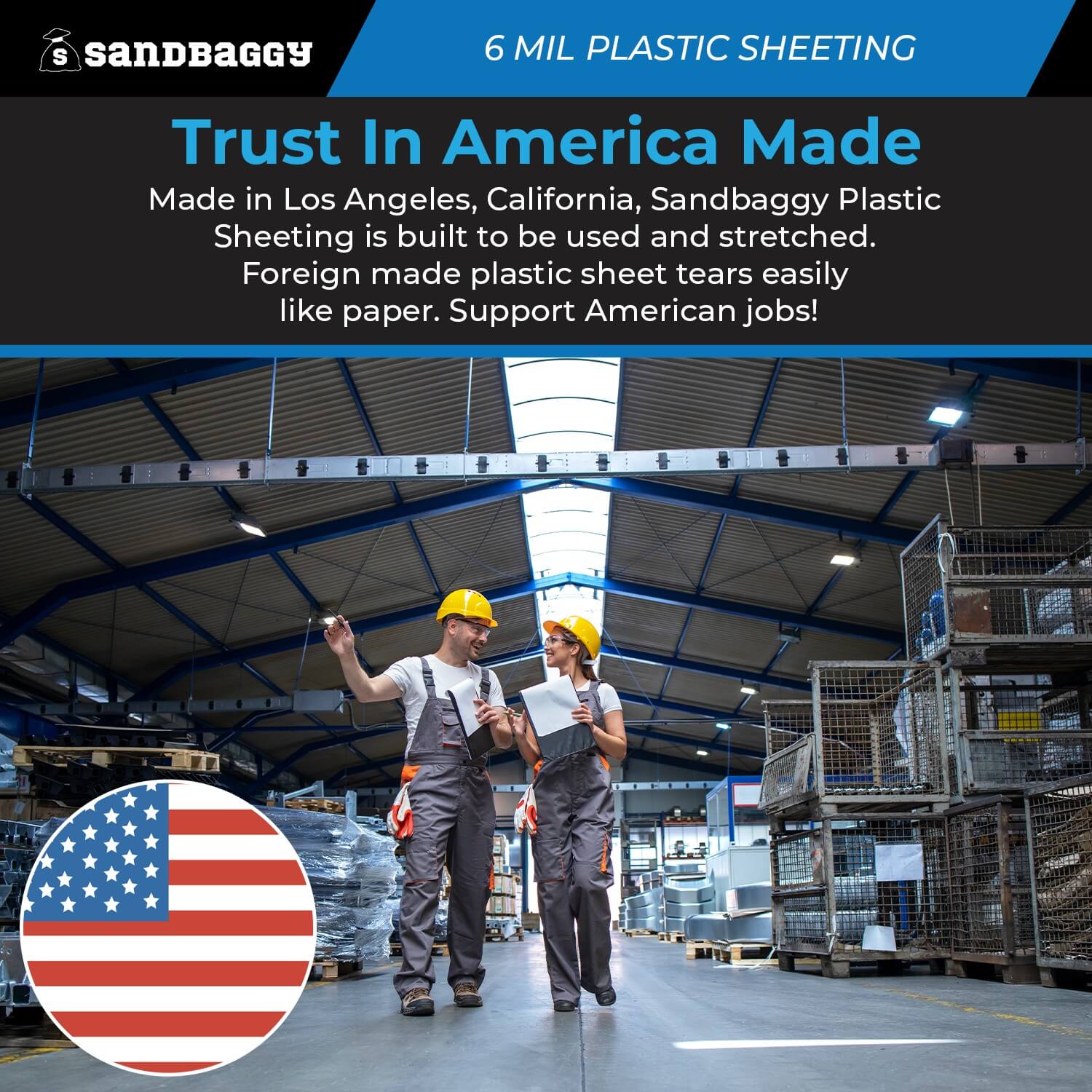 - TRUST IN AMERICAN MADE - Made in Los Angeles, California, Sandbaggy Plastic Sheeting is built to be used and stretched. Foreign made plastic sheet tears easily like paper. Support American jobs!