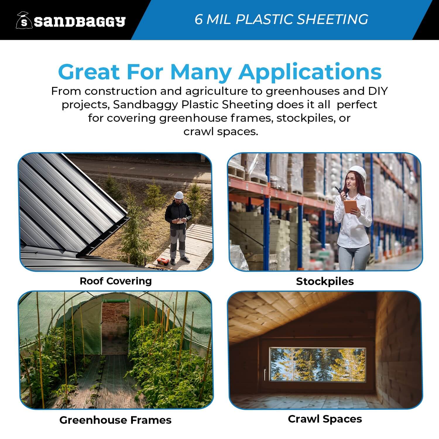 - GREAT FOR MANY APPLICATIONS - From construction and agriculture to greenhouses and DIY projects, Sandbaggy Plastic Sheeting does it all — perfect for covering greenhouse frames, stockpiles, or crawl spaces.