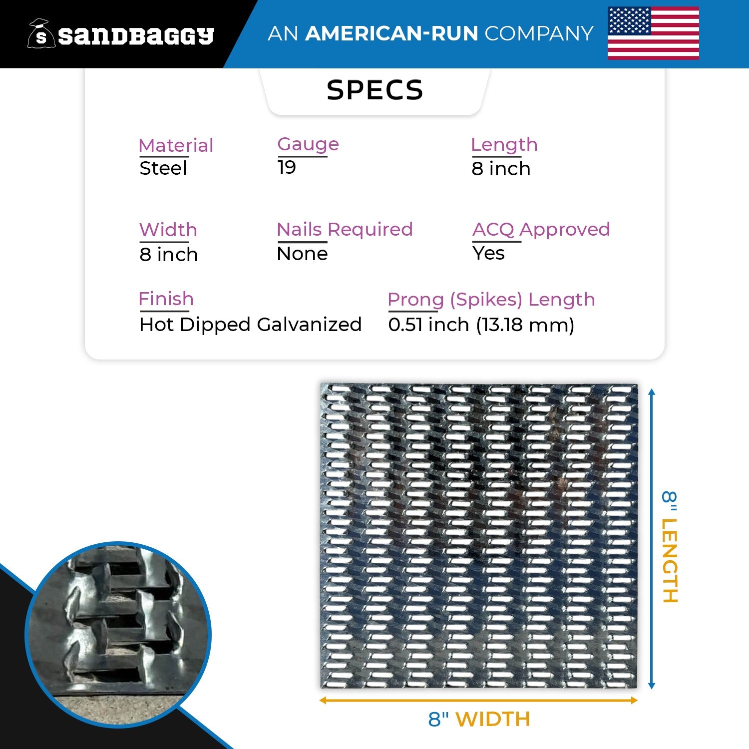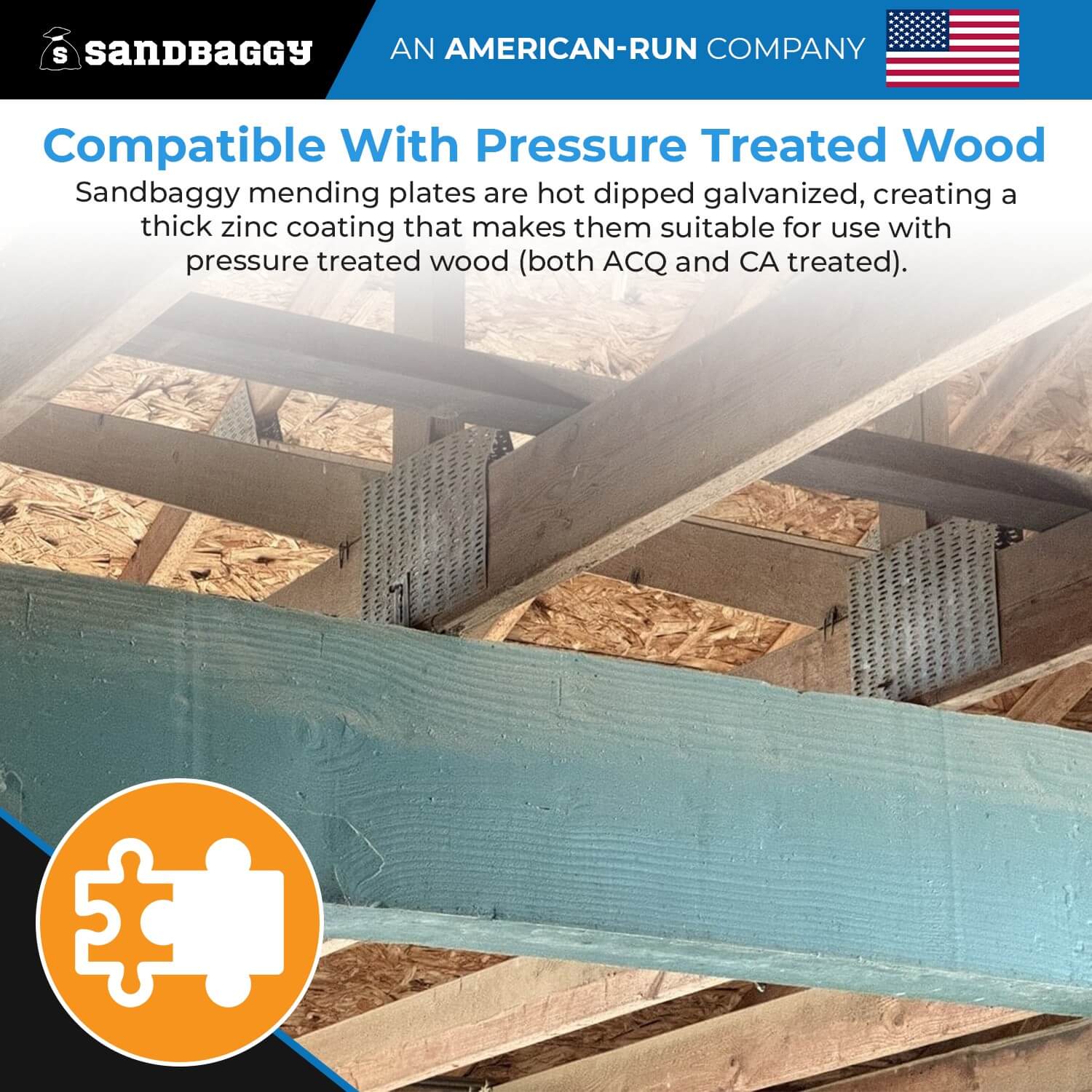 - Compatible With Pressure Treated Wood: Sandbaggy mending plates are hot dipped galvanized, creating a thick zinc coating that makes them suitable for use with pressure treated wood (both ACQ and CA treated).