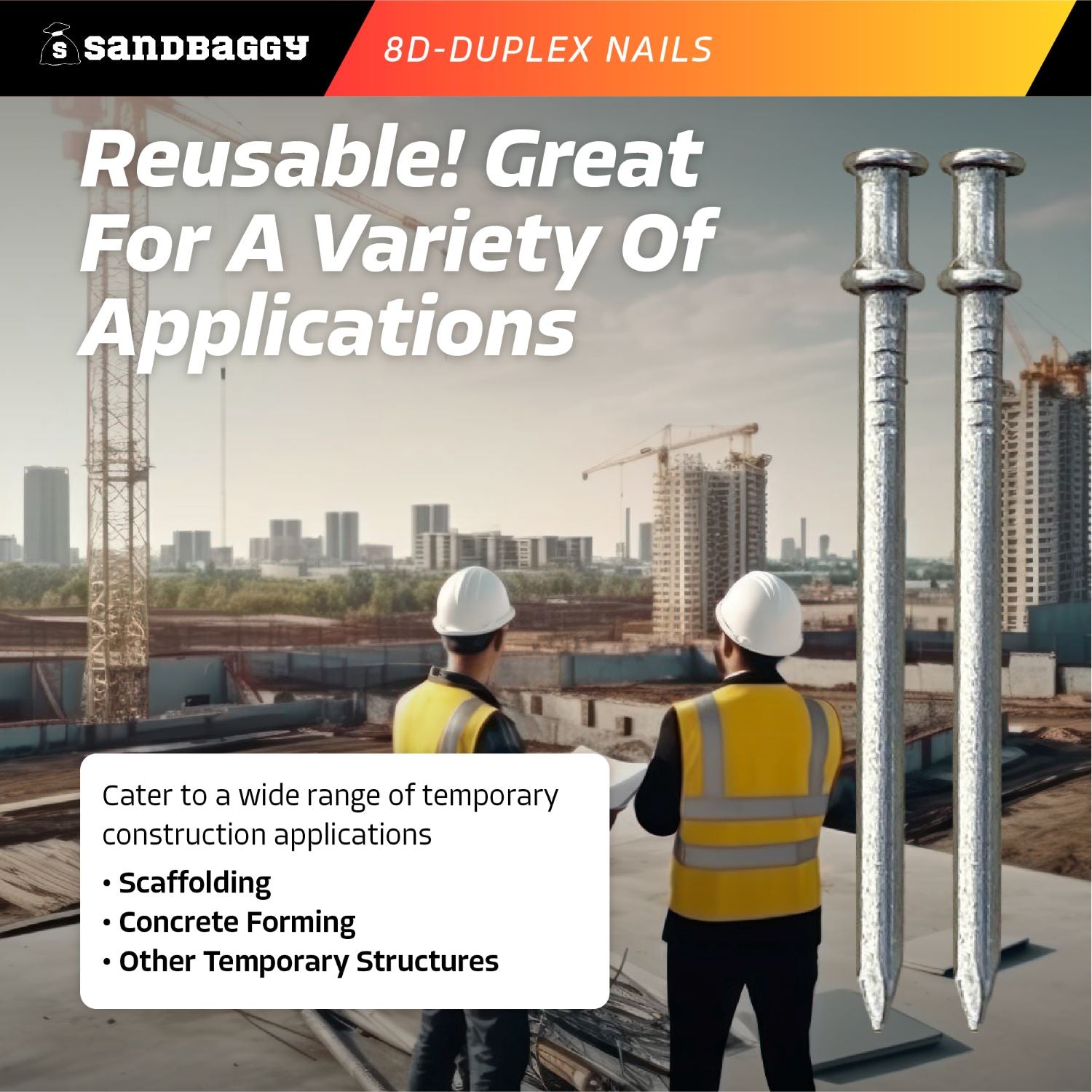 - Construction Grade: Sandbaggy 8D Duplex Nails are constructed from a 10 gauge black annealed steel offering exceptional strength and resilience, able to withstand the demands of temporary construction.