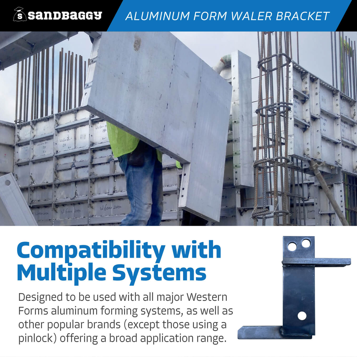 Sandbaggy's Aluminum Concrete Form Waler Brackets are designed to simplify and enhance the construction process. Compatible with all Western Forms aluminum forming systems and similar models (except those using pinlocks), these Waler Brackets ensure precise alignment and robust support for concrete forms.