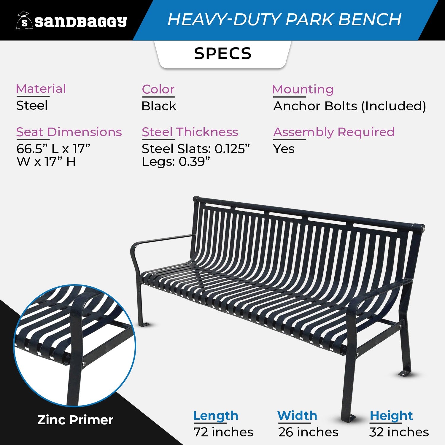 Sandbaggy’s Commercial Park Bench is made to last, crafted from 11-gauge powder-coated steel that can handle the demands of busy public spaces. We’ve taken extra steps to protect this strap metal bench from the elements by using a zinc-rich primer and powder coating, so it stays rust-free for a minimum of 10 years, even in tough weather conditions.