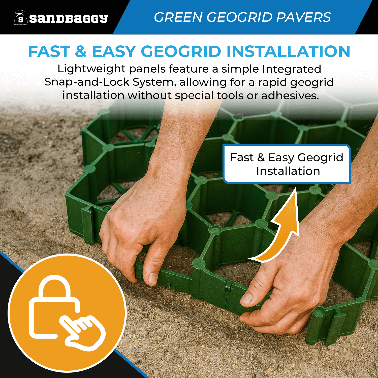 Sandbaggy geogrid pavers create a strong, stable, and permeable surface for any grass or gravel area. Our interlocking 1.5-inch deep honeycomb grids lock infill in place, preventing erosion and solving drainage issues permanently.