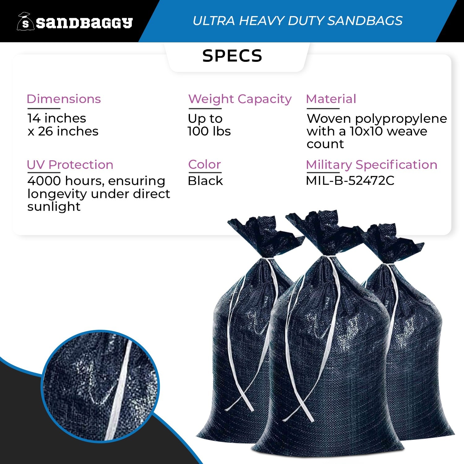 Sandbaggy's Heavy Duty Black Sandbags meet military specifications (MIL-B-52472C) and offer exceptional durability for flood control, erosion management, and vehicle weight stabilization. With a 100-pound capacity, enhanced UV resistance, and double-stitched construction, these black sandbags are built to last.
