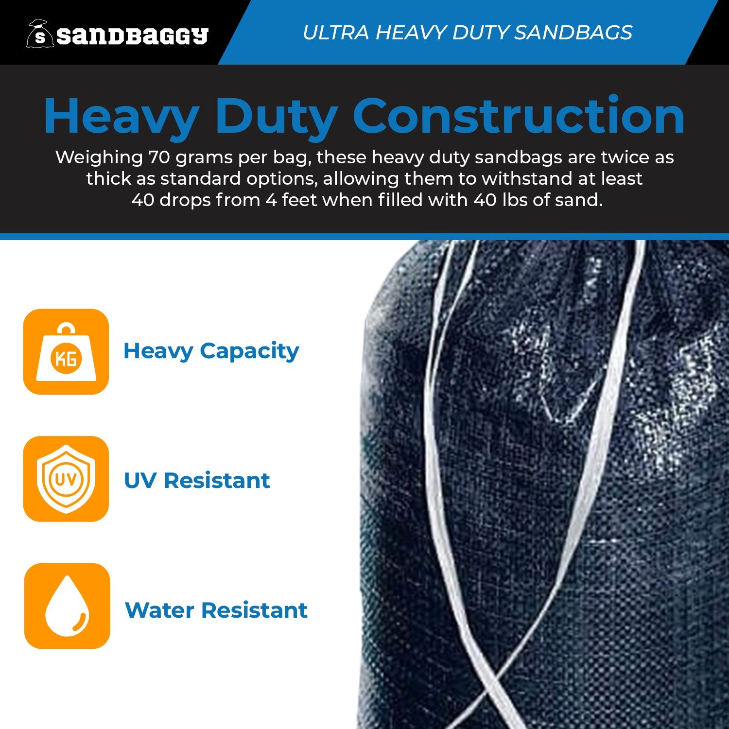 - Heavy Duty Construction: Weighing 70 grams per bag, these heavy duty sandbags are twice as thick as standard options, allowing them to withstand at least 40 drops from 4 feet when filled with 40 lbs of sand.