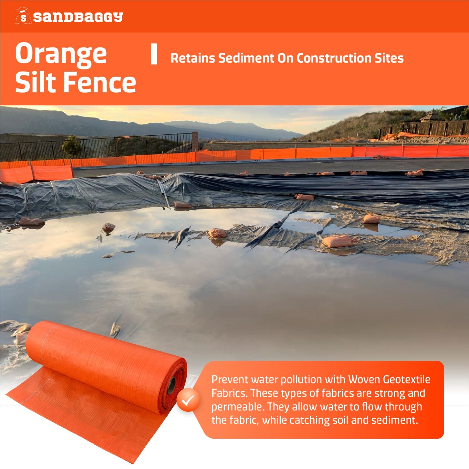 Sandbaggy Orange Silt Fence Fabric is a fast & effective temporary sediment and erosion control solution, perfect for construction job sites. This woven geotextile filter fabric allows water to pass through, but not soil. They are 3 ft wide and 500 ft long.