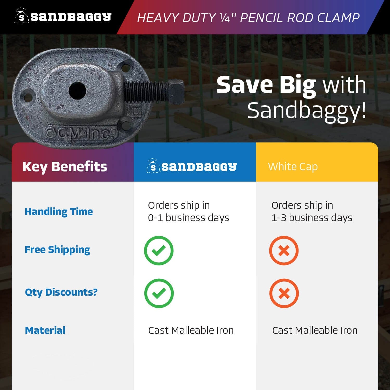 - Contractors Save Big With Sandbaggy: Our pencil rod clamps are for sale as low as $2.47 each when you buy in bulk.