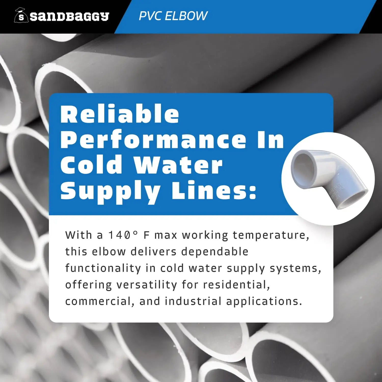 Reliable performance in cold water supply lines: With a 140° F max working temperature, this elbow delivers dependable functionality in cold water supply systems, offering versatility for residential, commercial, and industrial applications.
