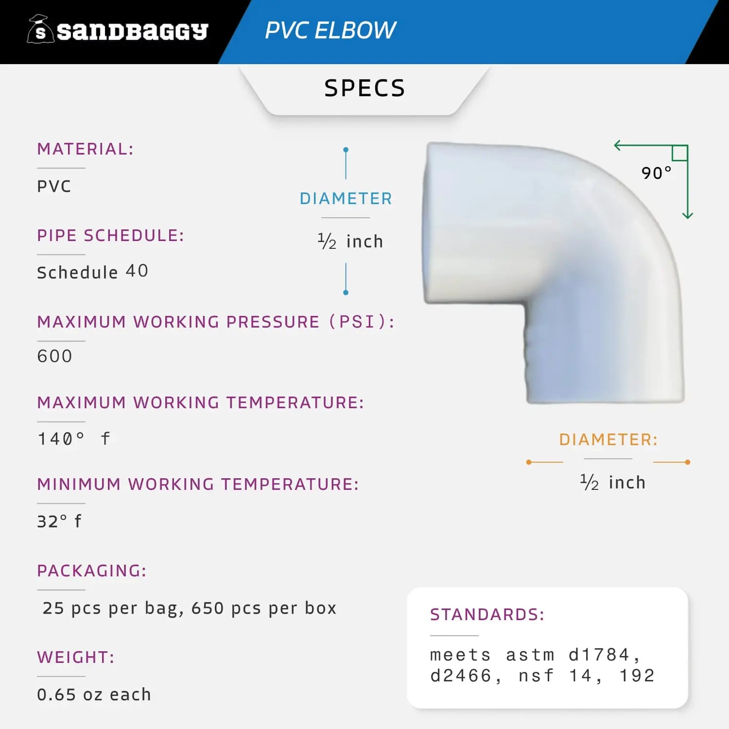 Standards compliance: This PVC elbow adheres to ASTM D1784, D2466, NSF 14, and 192 standards, ensuring high quality and safety.