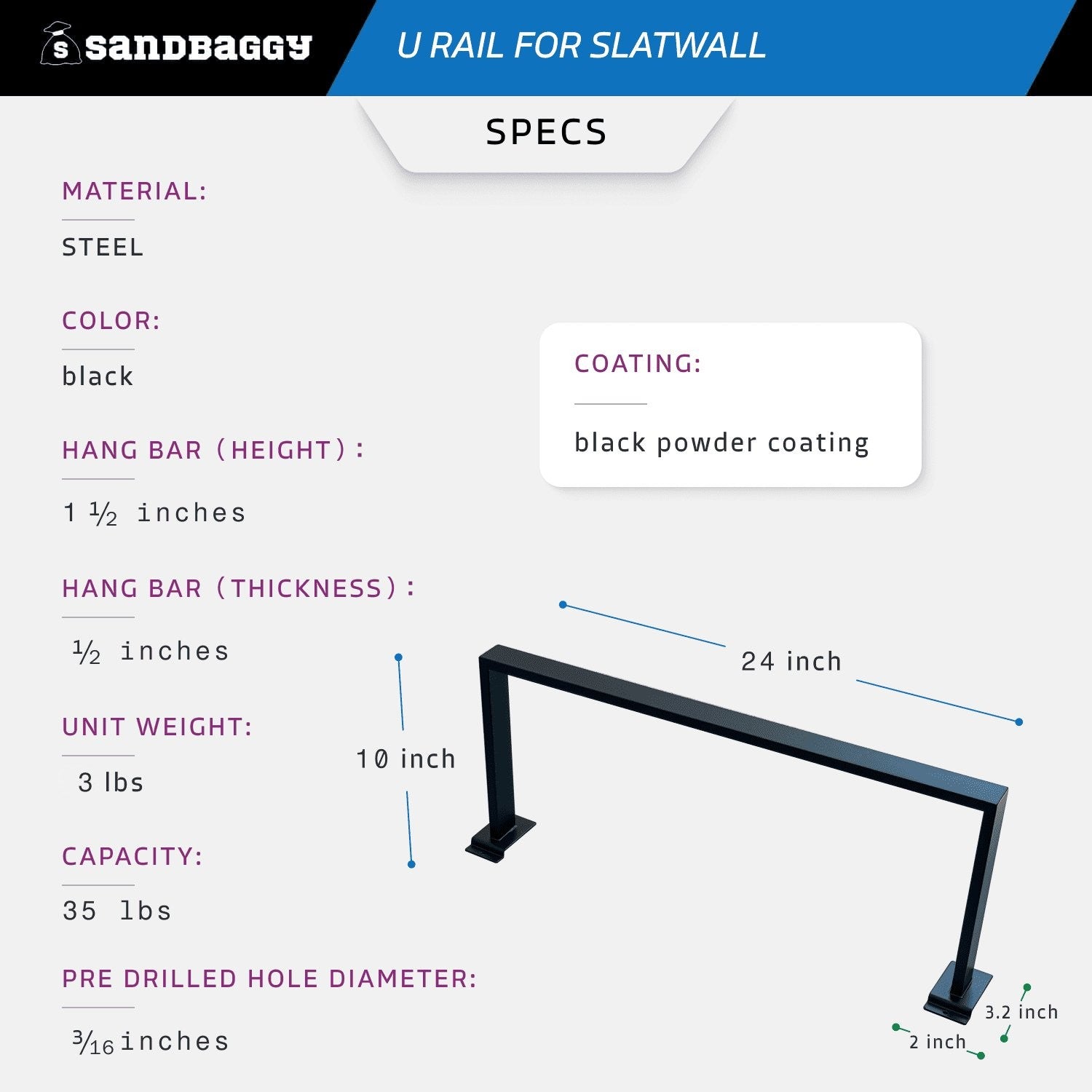 The U-shaped hangrail is pre-drilled for easy installation, featuring a hole diameter of 3/16". Built to withstand up to 35 lbs, this rail ensures that your items are secure while maximizing your space. Whether you’re a retailer or simply looking to organize your closet, our slat rail is your go-to solution for a neat and tidy display.