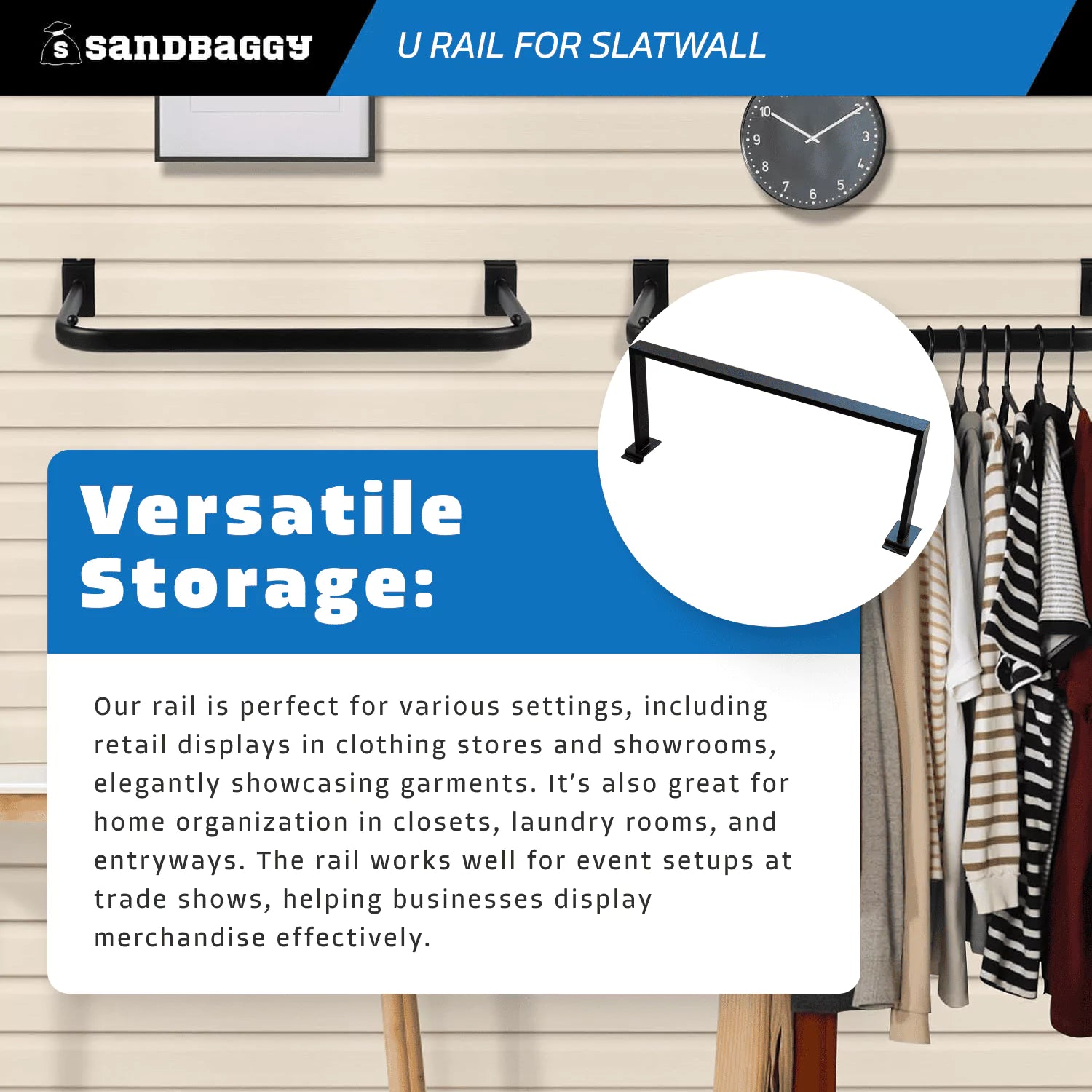 - Versatile Storage: Our rail is perfect for various settings, including retail displays in clothing stores and showrooms, elegantly showcasing garments. It’s also great for home organization in closets, laundry rooms, and entryways. The rail works well for event setups at trade shows, helping businesses display merchandise effectively.