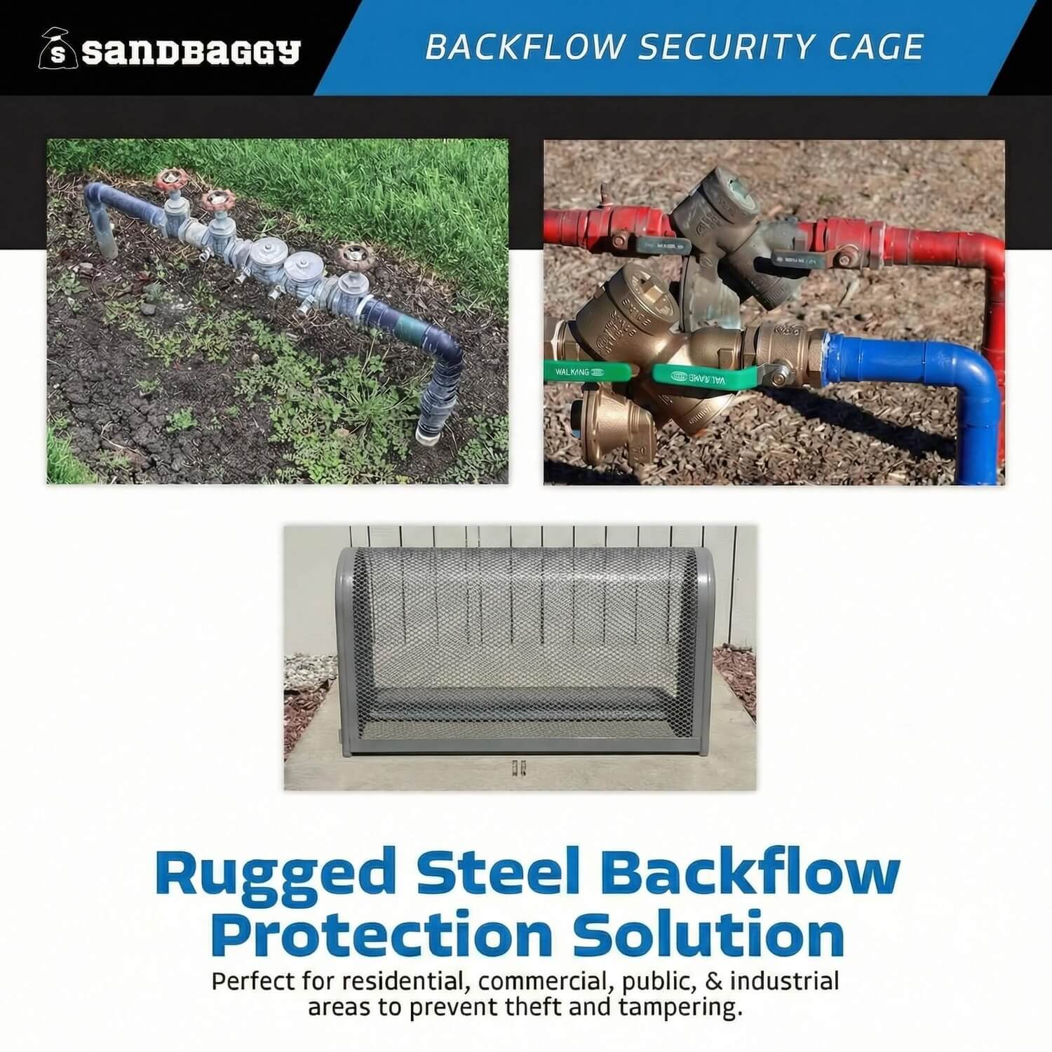 The Backflow Security Cage (also known as a is a Backflow Preventer Enclosure) heavy-duty protective solution designed to safeguard backflow prevention systems from damage, tampering, or unauthorized access. Made from high-strength alloy steel, it ensures long-term durability and security.
