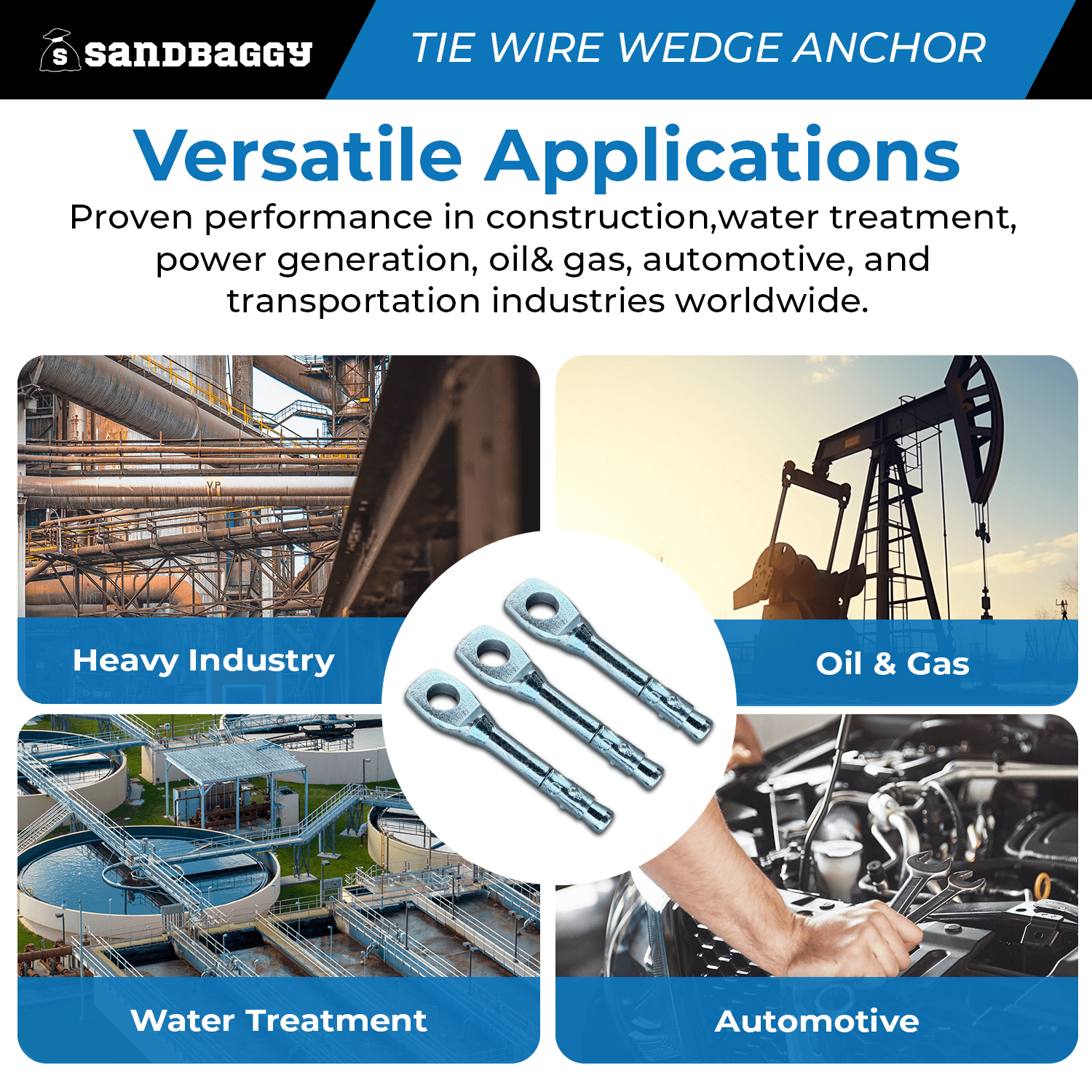 The Sandbaggy Tie-Wire Wedge Anchor (also known as eye bolt wedge anchors) is engineered for the modern professional who values speed, safety, and certainty. The integrated eyelet and superior expansion clip design let you work faster and more confidently on every job. Each anchor is zinc plated (galvanized) for protection against rust.