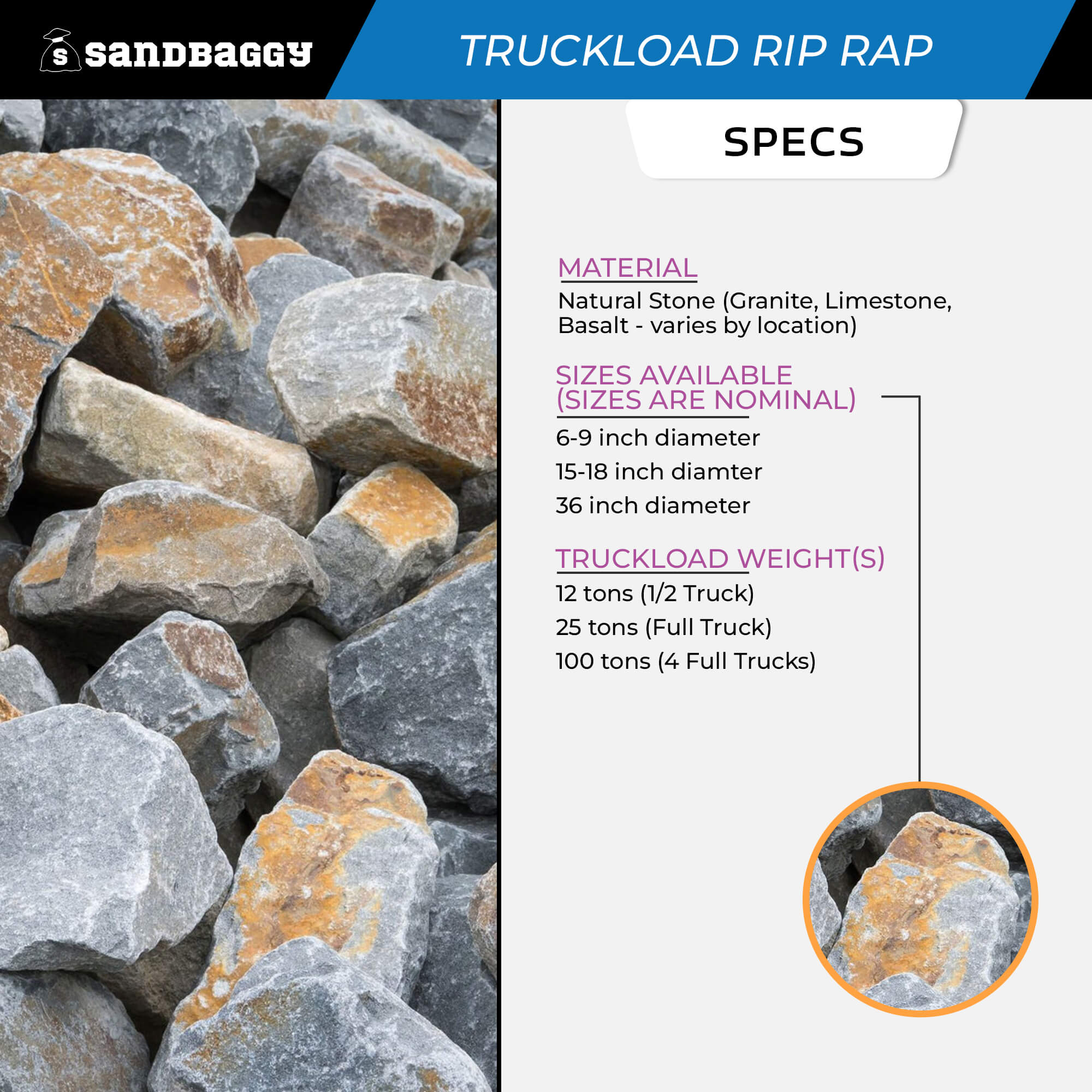 Need robust, large-scale erosion control? Sandbaggy's Truckload Rip Rap is the economical and effective bulk solution for contractors, municipalities, and large projects. Delivered directly to your site by the truckload, our natural stone rip rap provides long-lasting protection for shorelines, streambanks, bridge supports, slopes, and more.