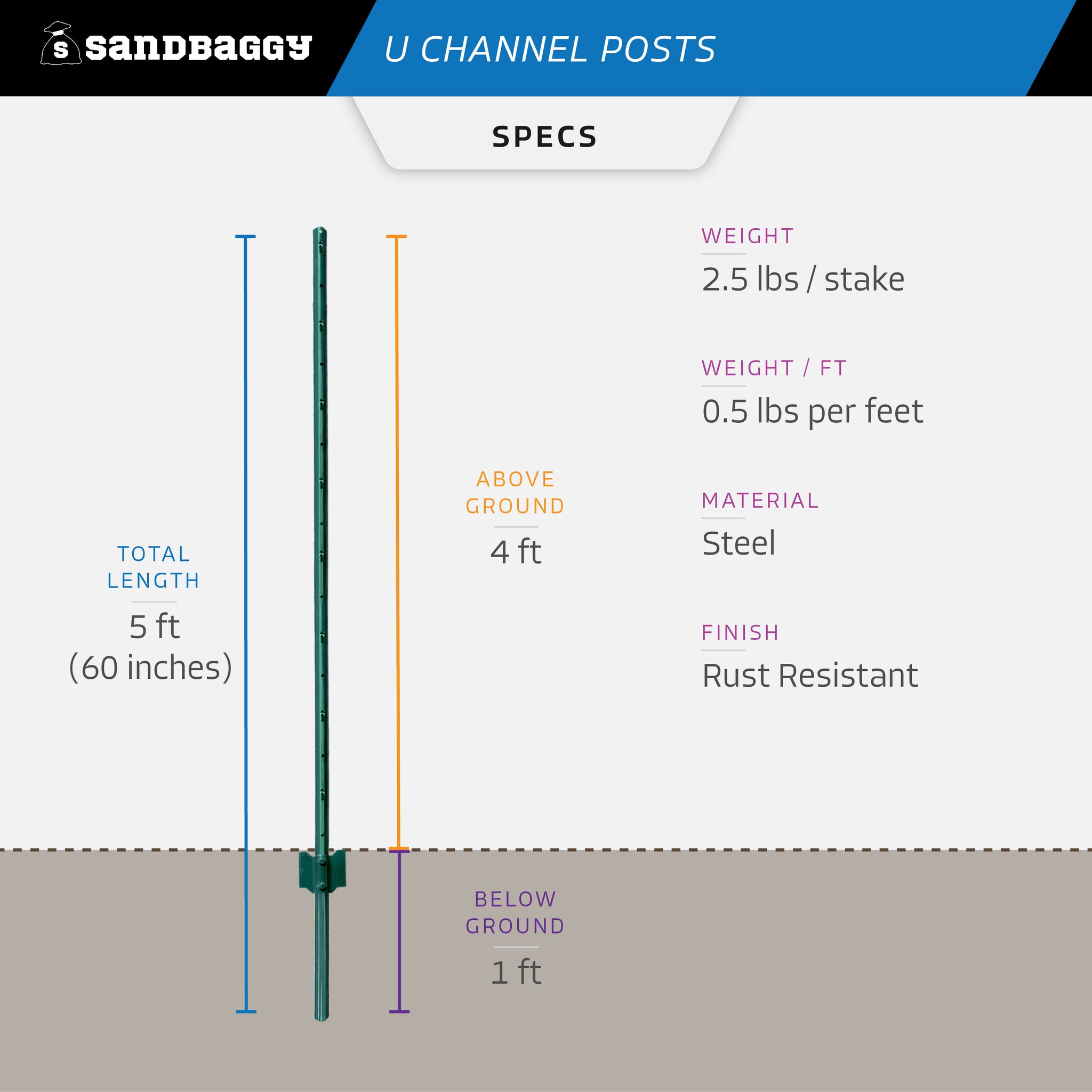 Install wire mesh fences in your garden or signs in your front yard with Sandbaggy's Green 5 ft U-Posts! Made from rust-resistant steel, these u channel fence posts offer continued protection from pests entering your garden, as well as being able to support and stabilize plants, such as a small tress. They are both wind and rust resistant for long lasting performance!